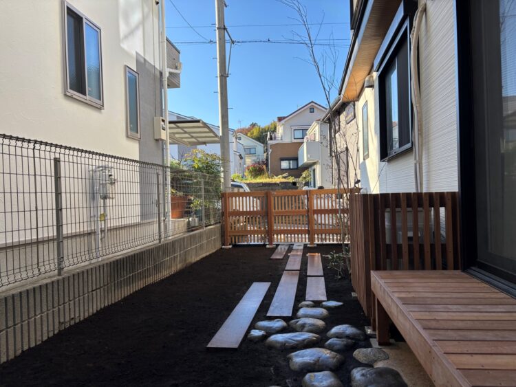 樹脂のウッドデッキのみのお庭からリフォームさせていただきました。